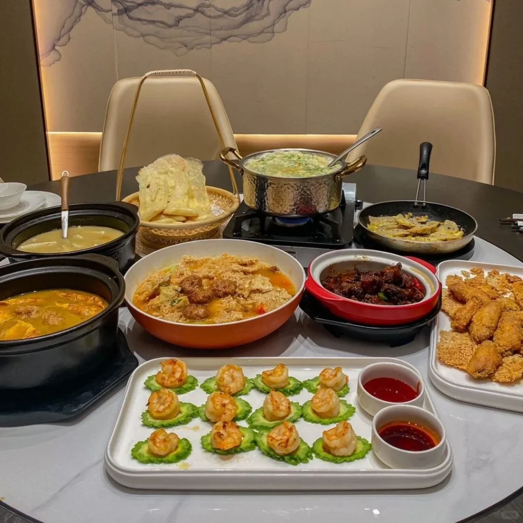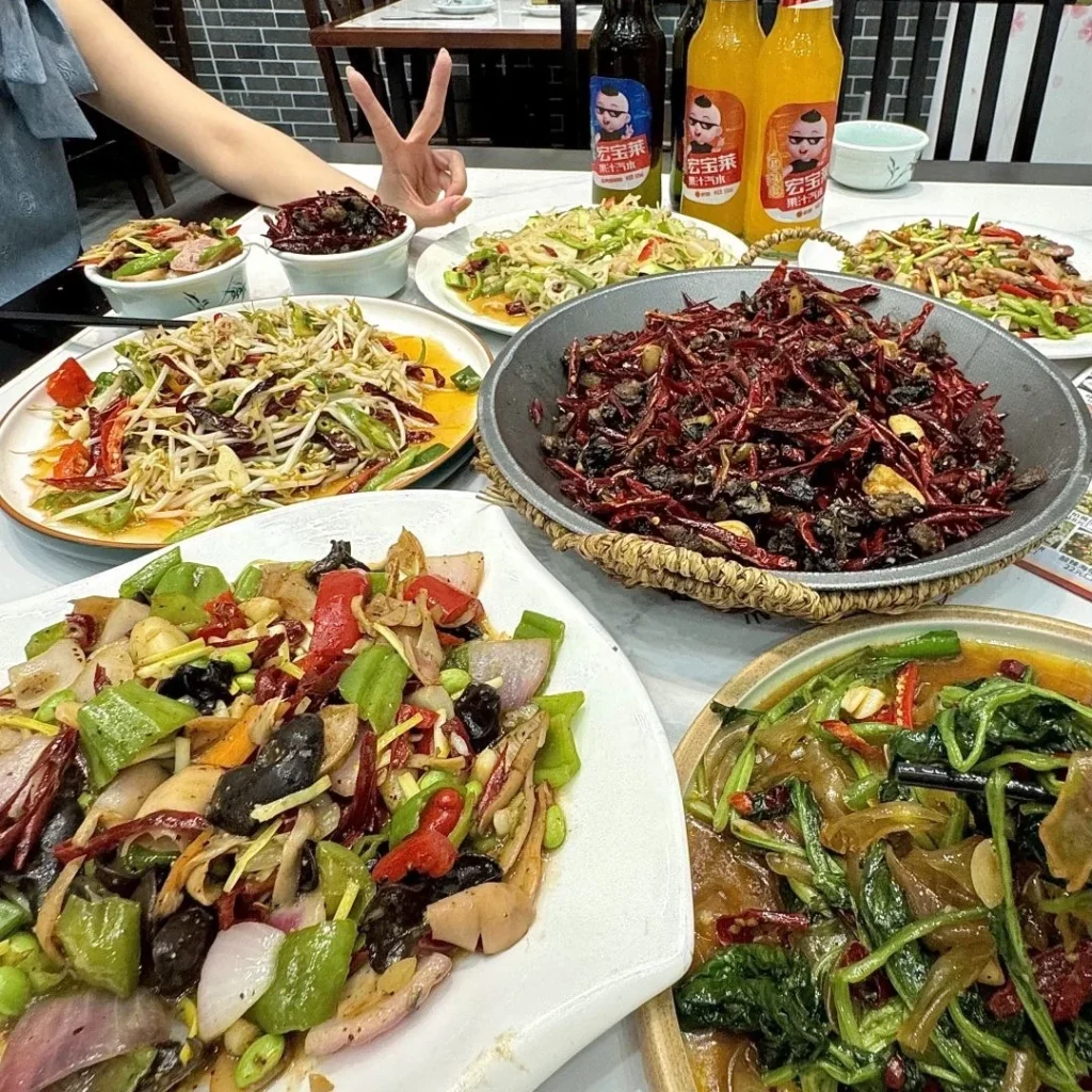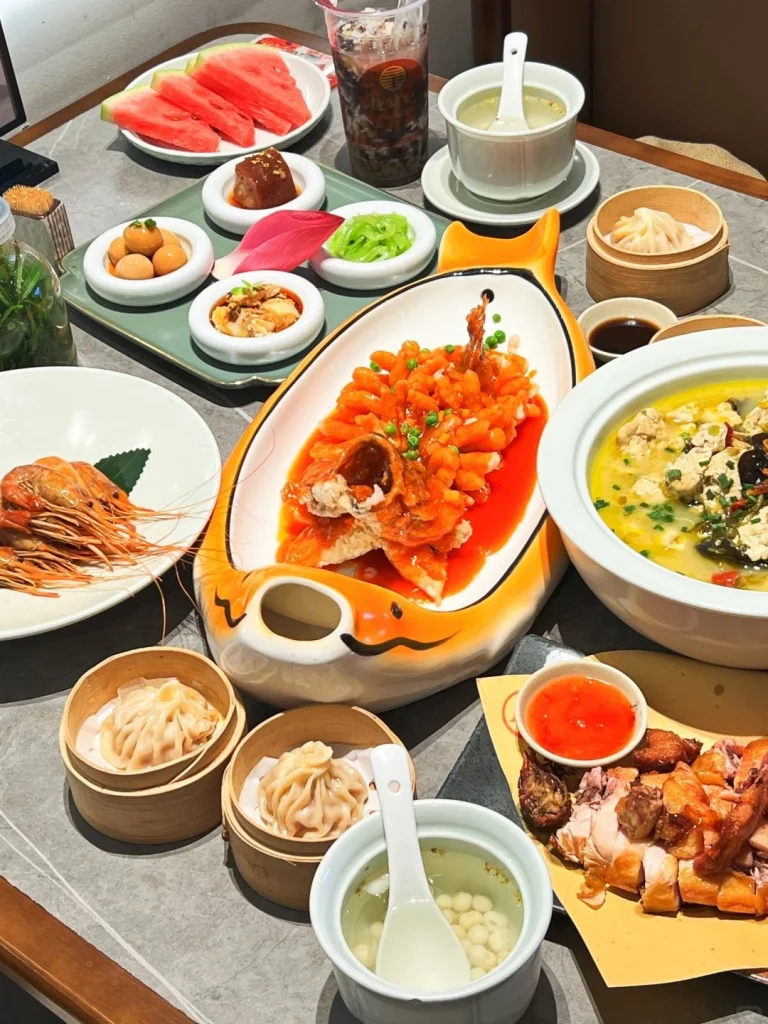 Famous dishes include Jinling roast duck, crystal pork trotter, and steamed crab meat lion’s head.