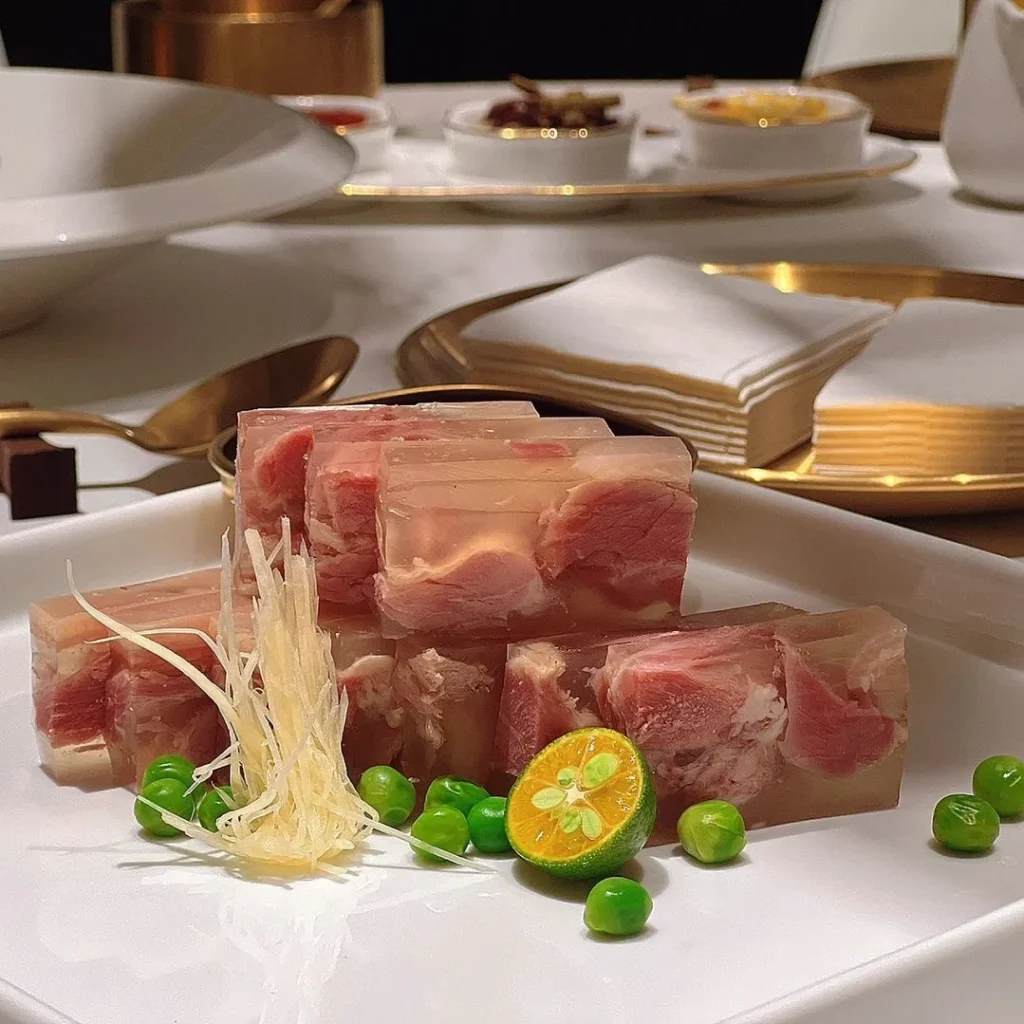 Famous Zhenjiang dish, made from pork leg, featuring translucent meat with a delicate, savory taste.