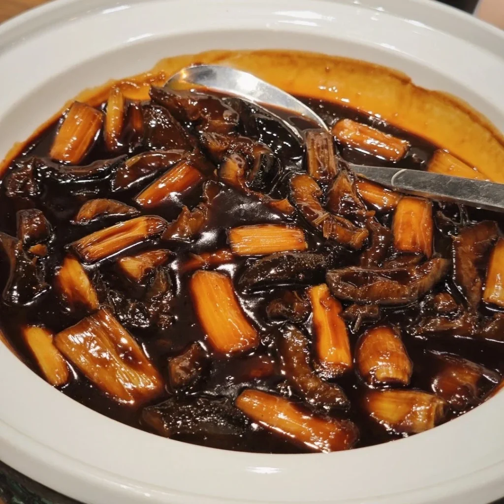 Soft, tender sea cucumber braised in a flavorful scallion sauce, offering a delightful balance of textures and flavors.