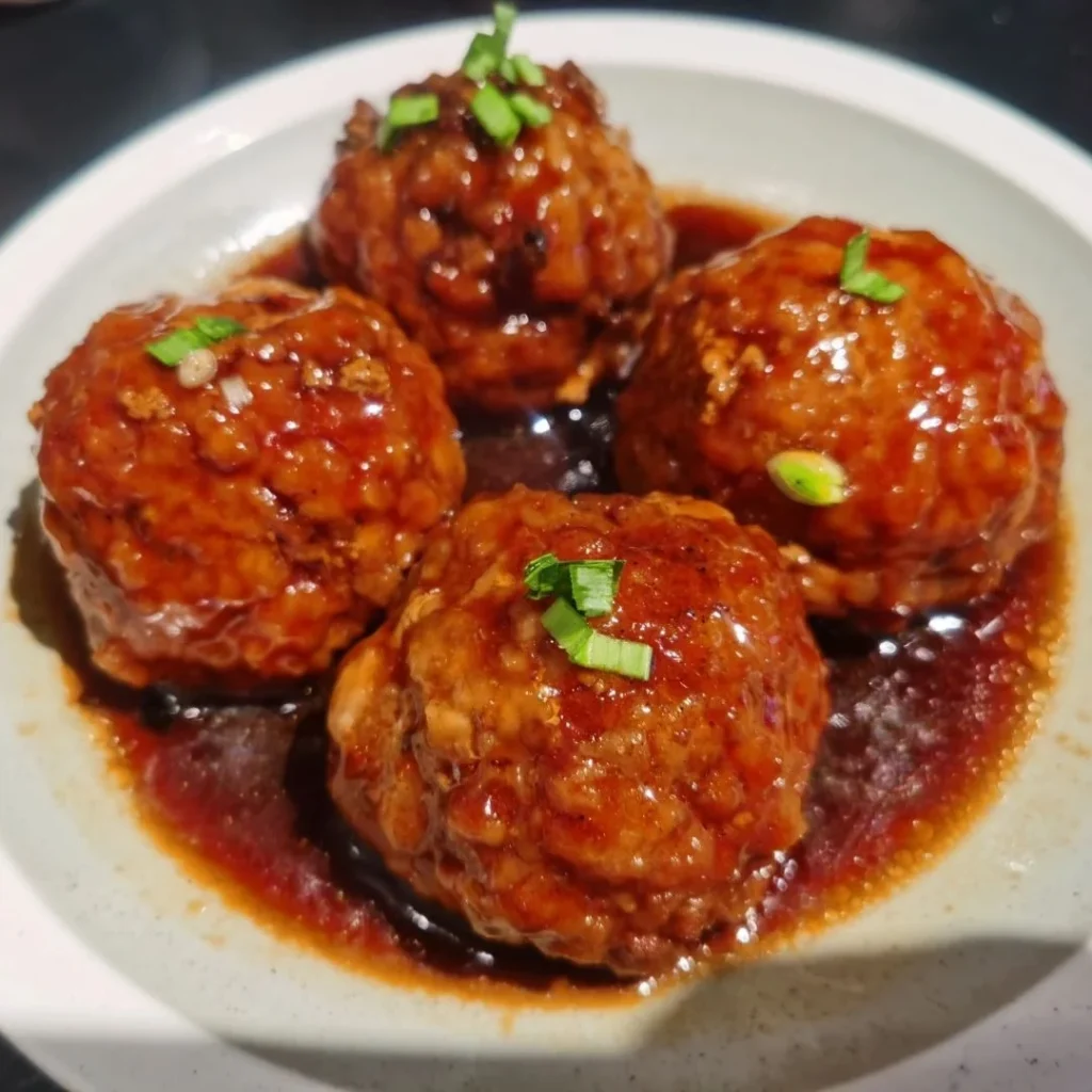 Tender, flavorful pork balls in a savory gravy, representing good fortune and happiness.