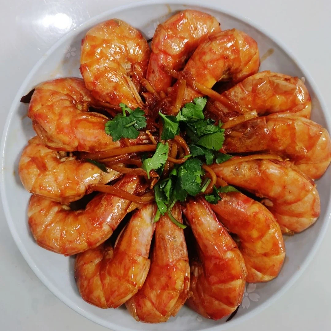 Succulent prawns braised to perfection in a rich, savory sauce that enhances the natural sweetness of the shrimp.