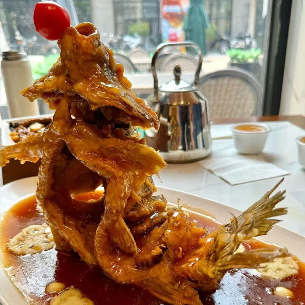 A beautifully presented whole carp, crispy on the outside and smothered in a tangy